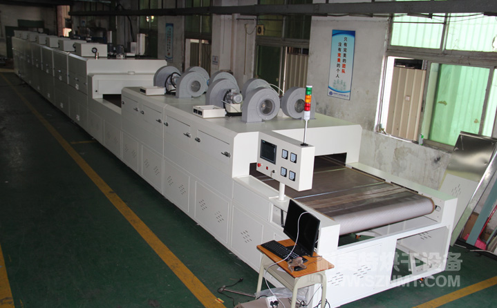 2、外形尺寸(約):總長(zhǎng)24500mm*總高1740mm*總寬1890mm,地面到網(wǎng)帶的高度為950-1050mm,爐體內(nèi)進(jìn)料高度為150mm;烘干部分總長(zhǎng)14000mm,分7段獨(dú)立控溫(每段4個(gè)測(cè)溫?zé)犭娕迹慷?000mm。冷卻段長(zhǎng)4000mm,UV區(qū)2000mm,前后緩沖區(qū)各長(zhǎng)500mm,進(jìn)料部分長(zhǎng)2000mm,出料部分長(zhǎng)1500mm, 爐體前后大梁上方裝有急停開(kāi)關(guān),共4個(gè)。